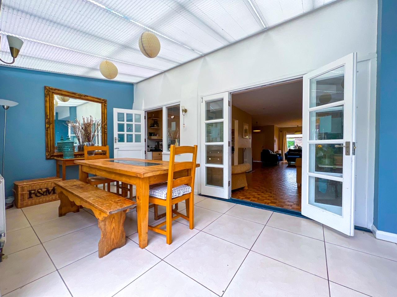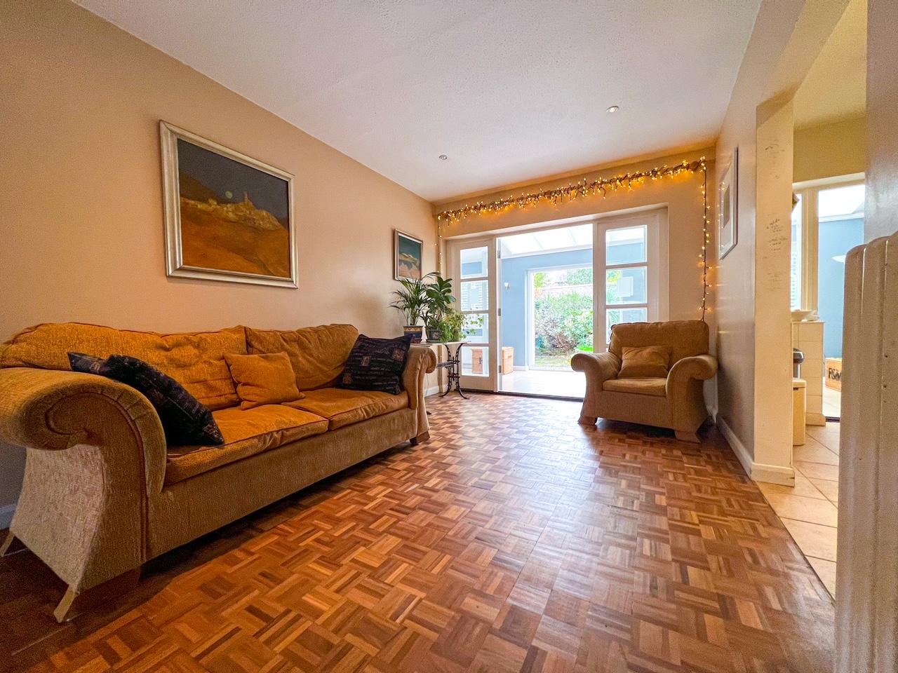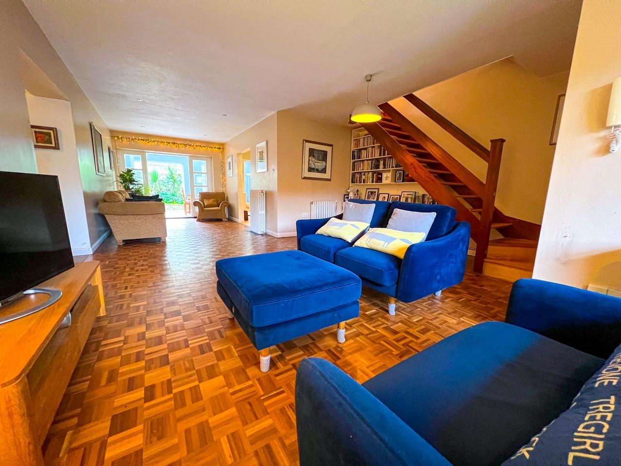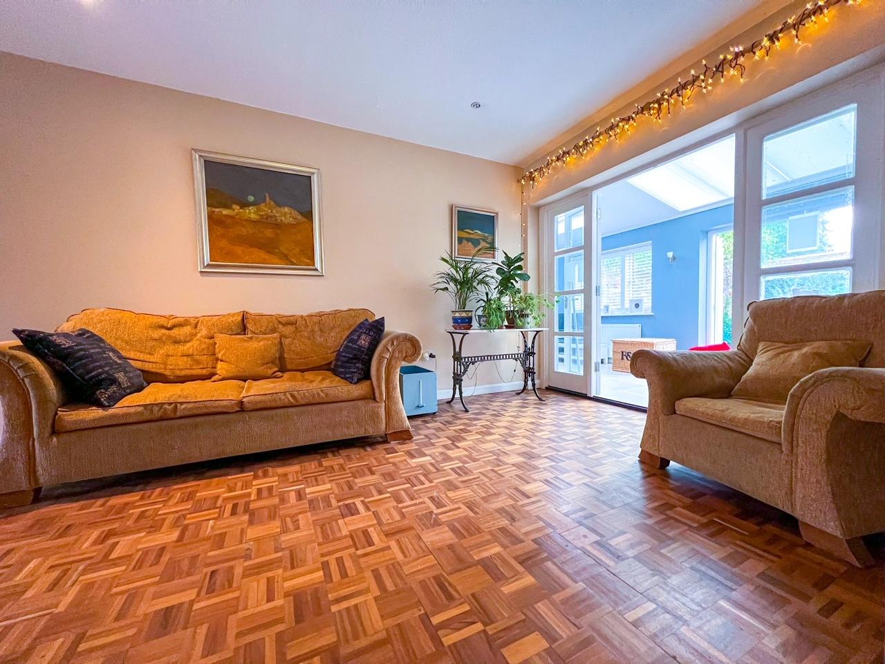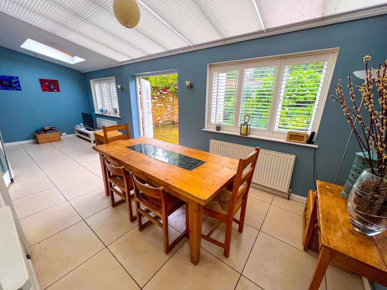 The accommodation comprises; an entrance hallway that leads to a cloakroom and to a large and bright open plan reception room/living room with original wood block hardwood parquet flooring, a hardwood open tread staircase and feature cast iron radiators. The large office space with built-in bookcases and the utility room which includes space for fridge and plumbing for washing machine, both lead off the living room as does the modern kitchen. Glazed French doors lead to the large dining room with skylight and glazed roof that benefits from access to the garden through patio French doors and additional living area.