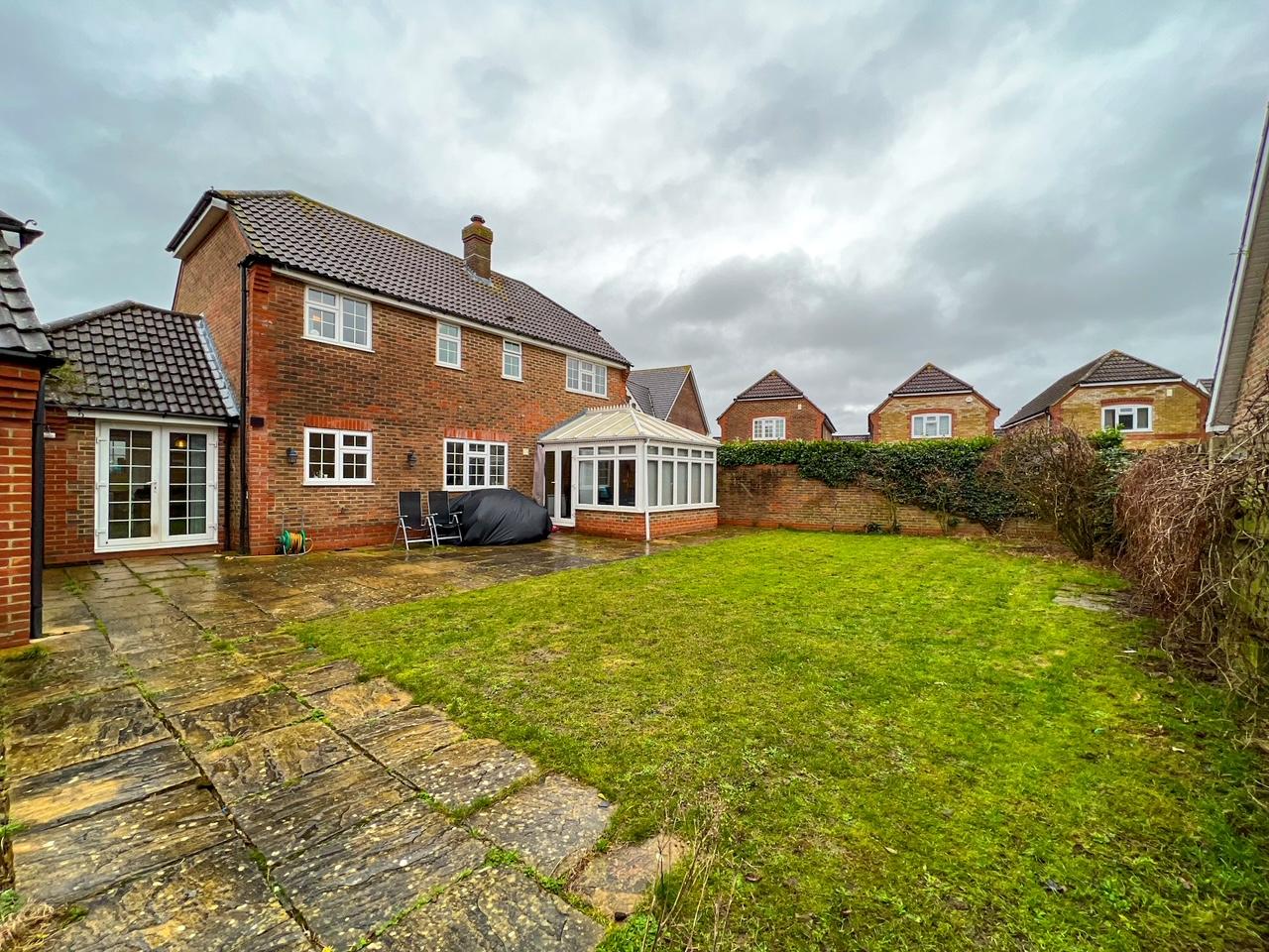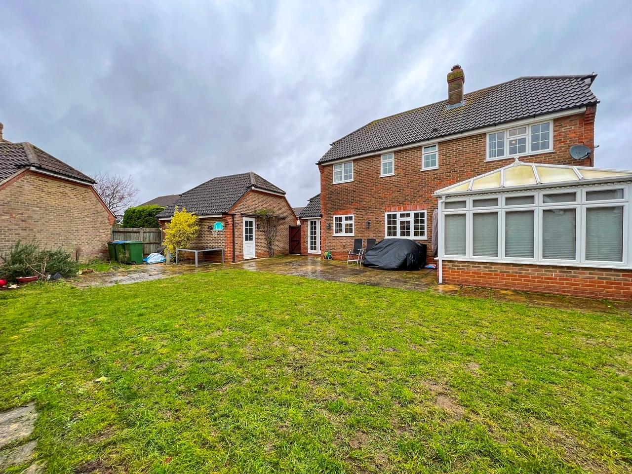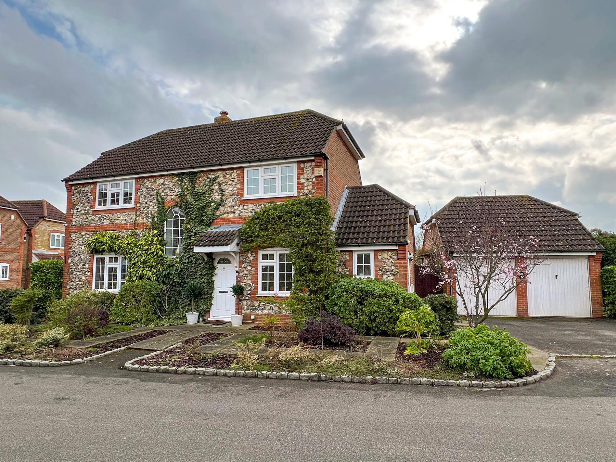 Tudors of East Molesey are pleased to offer for sale this rarely available, attractive flint faced Charles Church four double bedroom detached home occupying a corner plot within a quiet cul-de-sac in the Bishop Fox Development. Larger than the average four bedroom homes within the development the property benefits by having a comfortable living room, a conservatory, a study and a large modernized kitchen/breakfast room with separate utility room. Turning stairs with large pretty landing window leads to four bedrooms, master with en-suite and family bathroom. Externally there is a wide southerly garden and a detached double garage with off road parking.