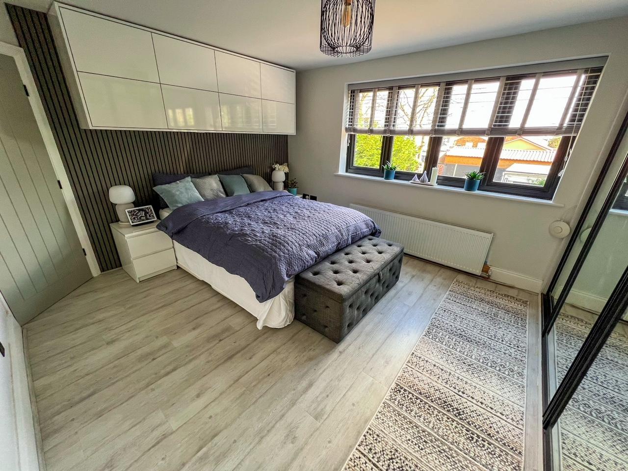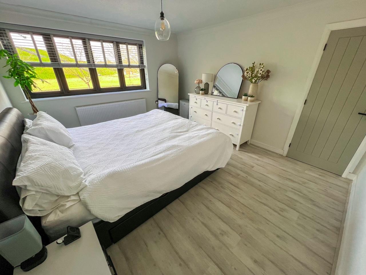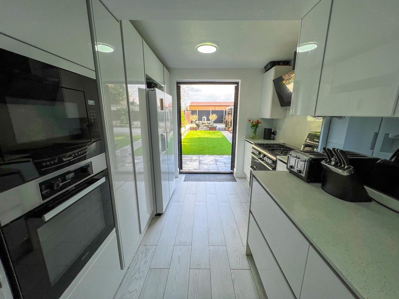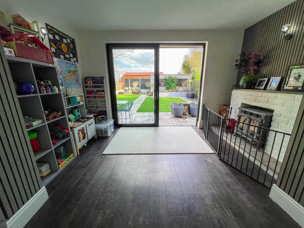 The property comprises; a composite front door opens onto an entrance hallway with luxury Oak vinyl tiling, a modernised downstairs shower room with WC and white sink with Quartz counter top, a spacious and wide living room with extended separate play area with wood burning stove with double-glazed aluminum patio doors opening onto the rear garden. There is also a separate dining room, a home office/games room/children’s play room and an extended modernised kitchen (installed in 2022) with double glazed French doors to the garden. The kitchen has many white eye/base level units/cupboard with Quartz work tops, Porcelain tiled wood effect flooring and integrated appliances including: oven, microwave, dishwasher, fridge/freezer and space for double sized cooker, American fridge/freezer, washing machine and tumble dryer.