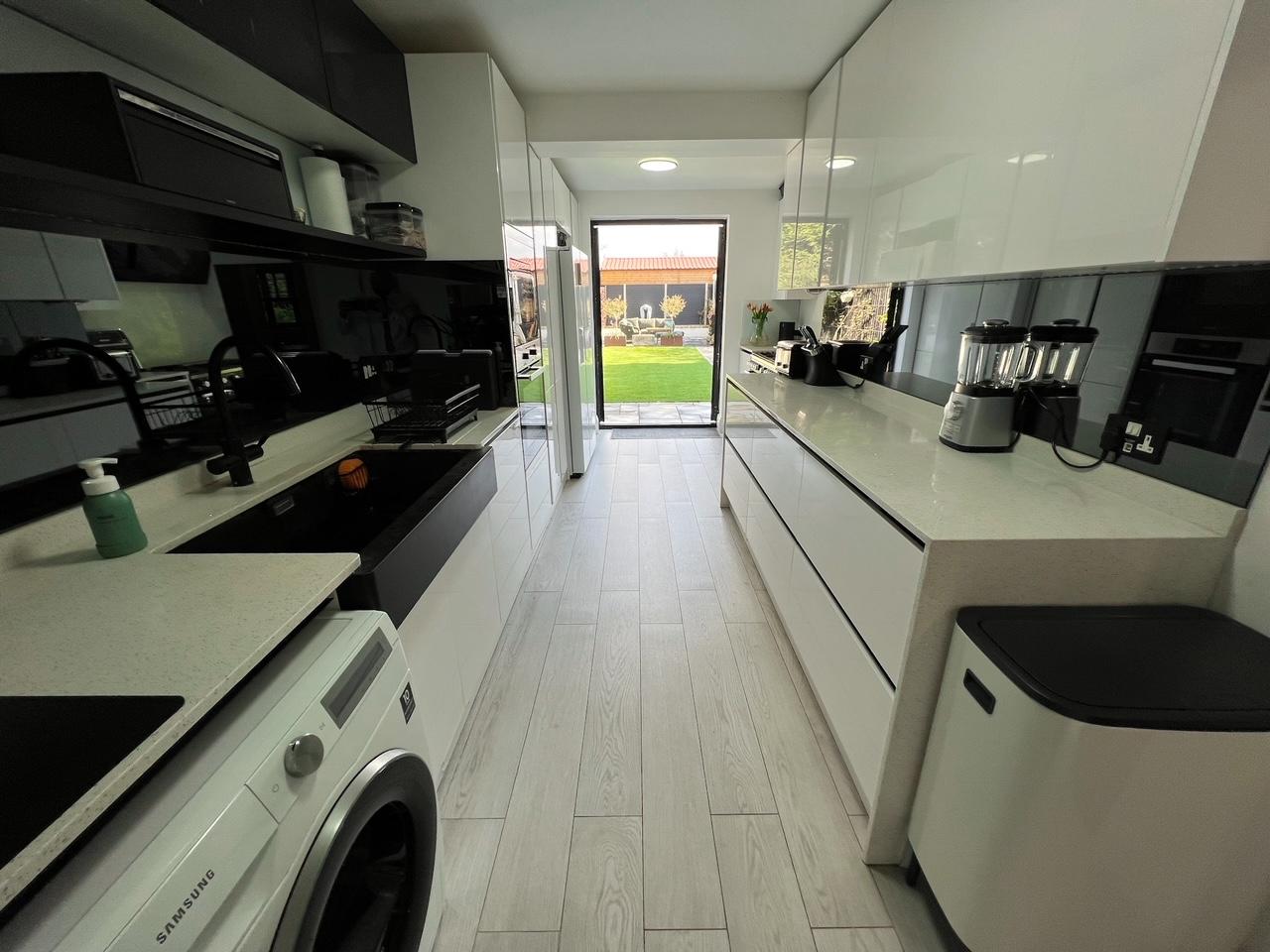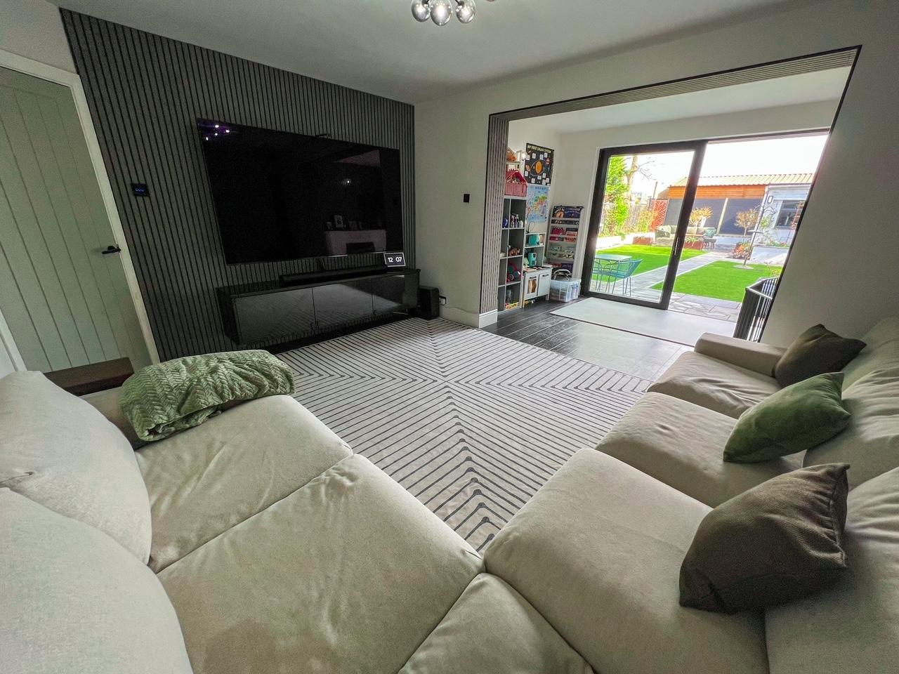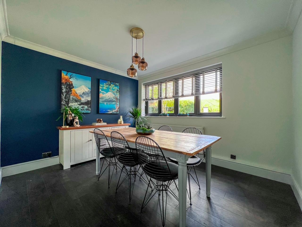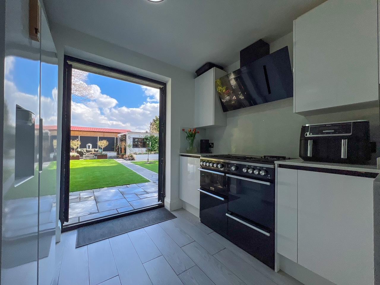The property comprises; a composite front door opens onto an entrance hallway with luxury Oak vinyl tiling, a modernised downstairs shower room with WC and white sink with Quartz counter top, a spacious and wide living room with extended separate play area with wood burning stove with double-glazed aluminum patio doors opening onto the rear garden. There is also a separate dining room, a home office/games room/children’s play room and an extended modernised kitchen (installed in 2022) with double glazed French doors to the garden. The kitchen has many white eye/base level units/cupboard with Quartz work tops, Porcelain tiled wood effect flooring and integrated appliances including: oven, microwave, dishwasher, fridge/freezer and space for double sized cooker, American fridge/freezer, washing machine and tumble dryer.