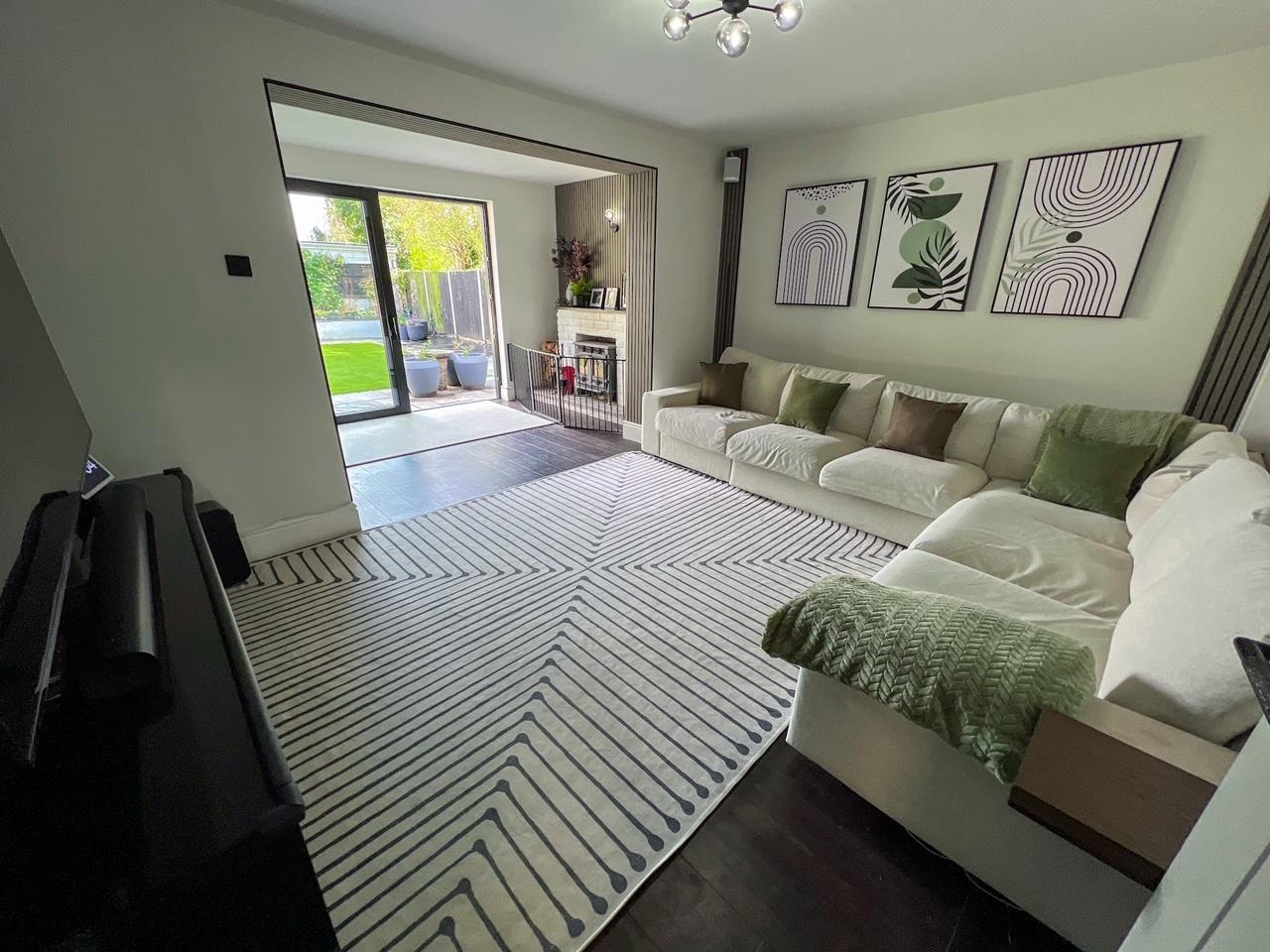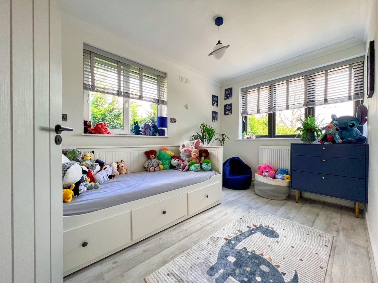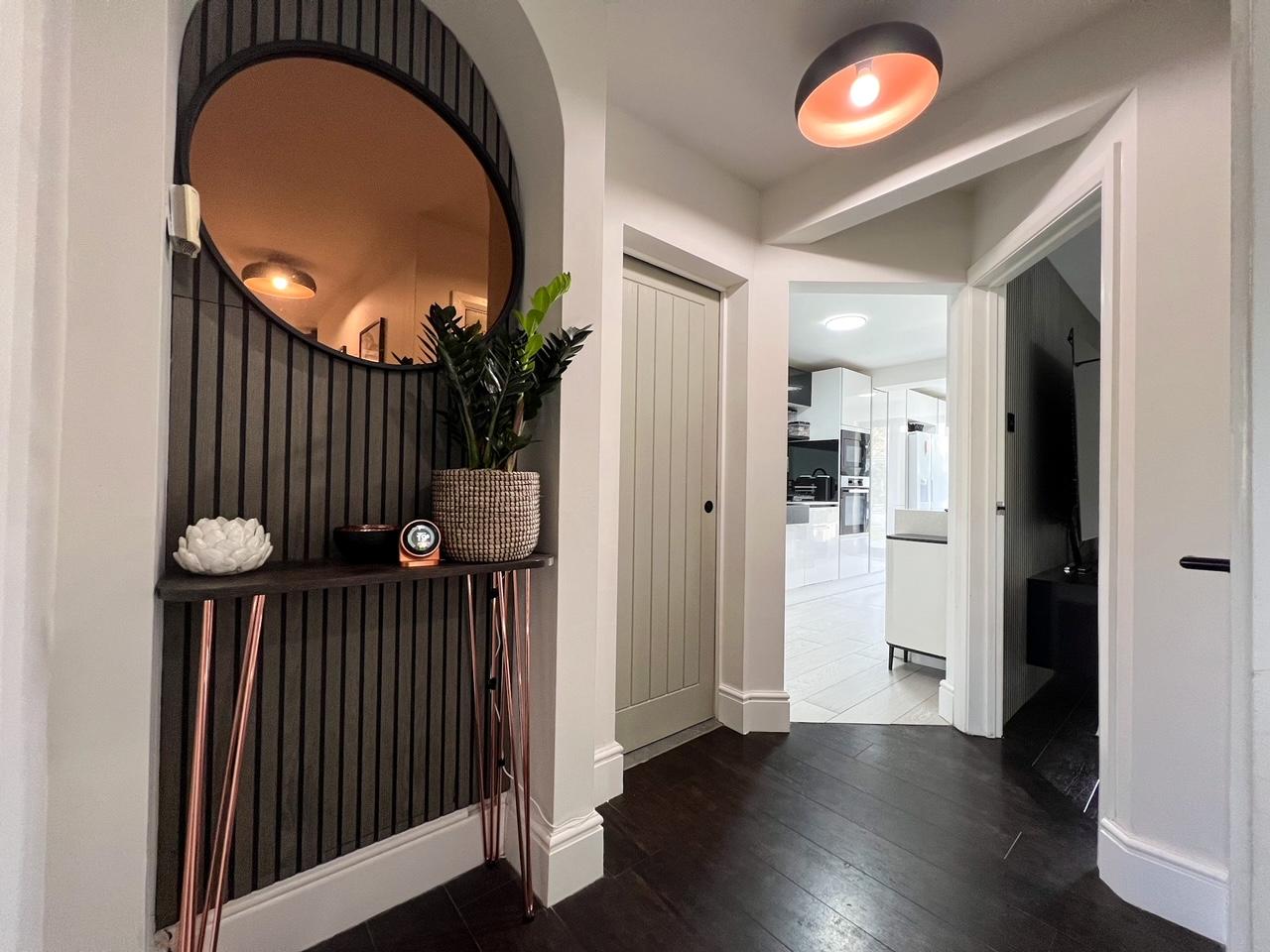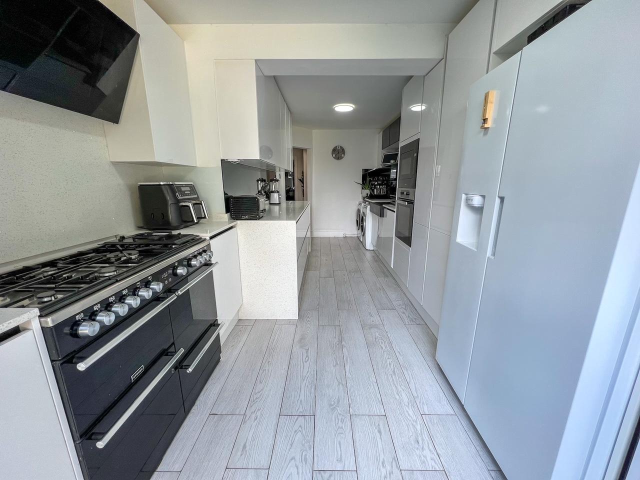 The property comprises; a composite front door opens onto an entrance hallway with luxury Oak vinyl tiling, a modernised downstairs shower room with WC and white sink with Quartz counter top, a spacious and wide living room with extended separate play area with wood burning stove with double-glazed aluminum patio doors opening onto the rear garden. There is also a separate dining room, a home office/games room/children’s play room and an extended modernised kitchen (installed in 2022) with double glazed French doors to the garden. The kitchen has many white eye/base level units/cupboard with Quartz work tops, Porcelain tiled wood effect flooring and integrated appliances including: oven, microwave, dishwasher, fridge/freezer and space for double sized cooker, American fridge/freezer, washing machine and tumble dryer.