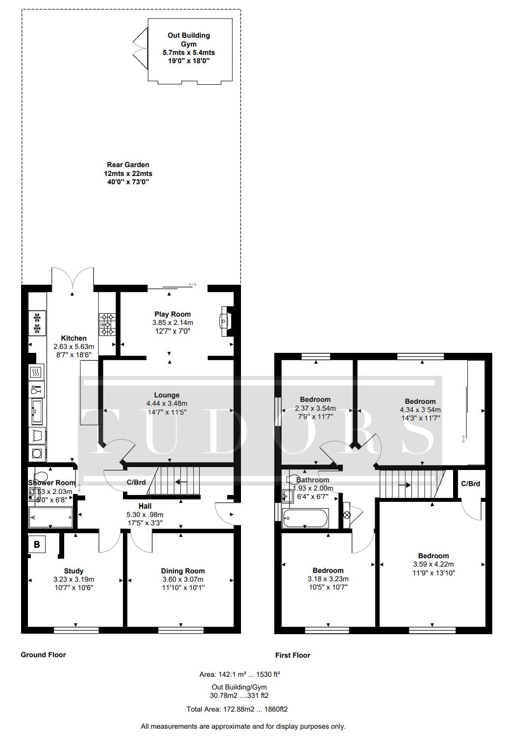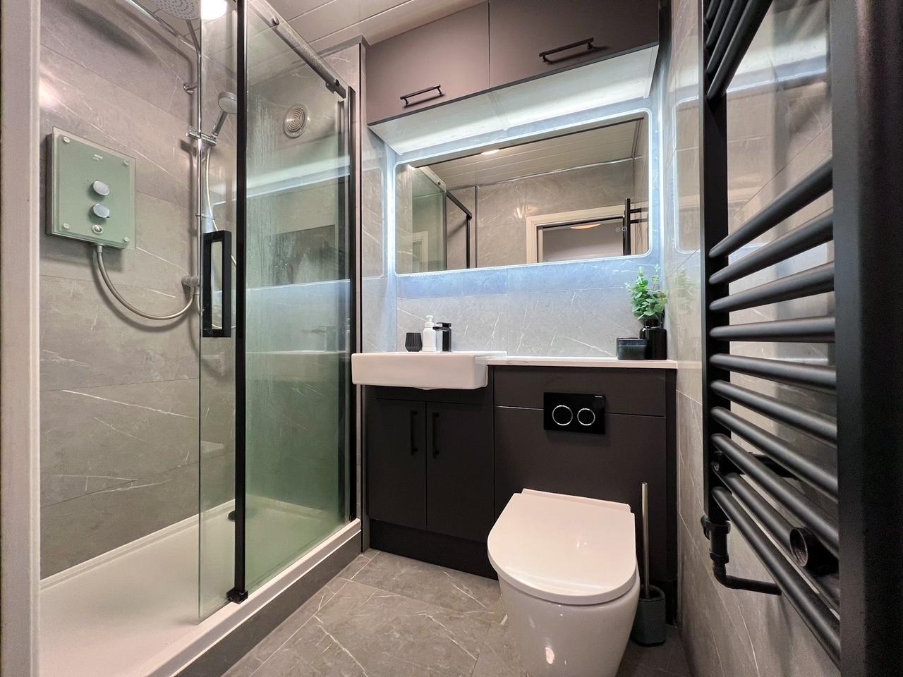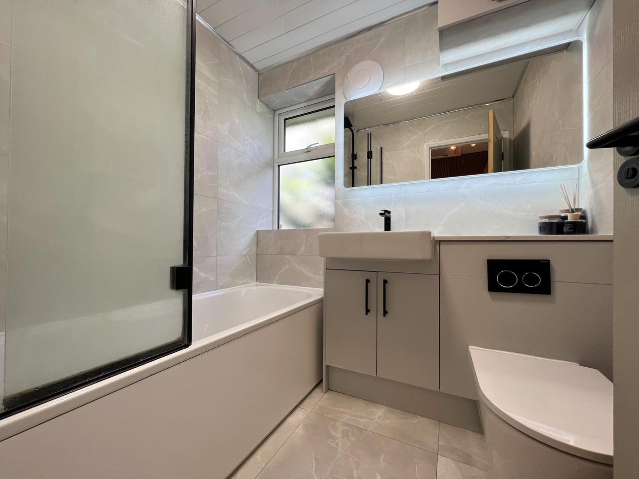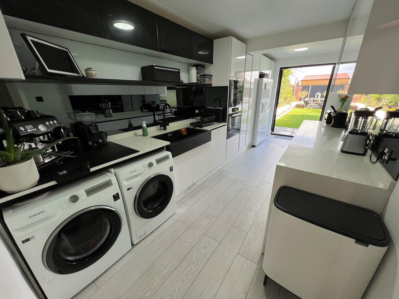 The property comprises; a composite front door opens onto an entrance hallway with luxury Oak vinyl tiling, a modernised downstairs shower room with WC and white sink with Quartz counter top, a spacious and wide living room with extended separate play area with wood burning stove with double-glazed aluminum patio doors opening onto the rear garden. There is also a separate dining room, a home office/games room/children’s play room and an extended modernised kitchen (installed in 2022) with double glazed French doors to the garden. The kitchen has many white eye/base level units/cupboard with Quartz work tops, Porcelain tiled wood effect flooring and integrated appliances including: oven, microwave, dishwasher, fridge/freezer and space for double sized cooker, American fridge/freezer, washing machine and tumble dryer.