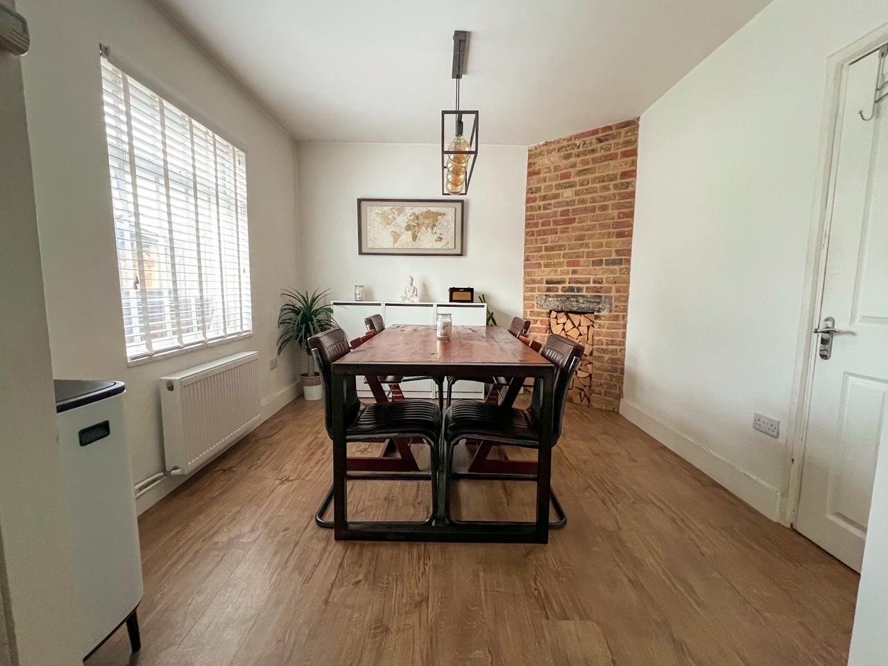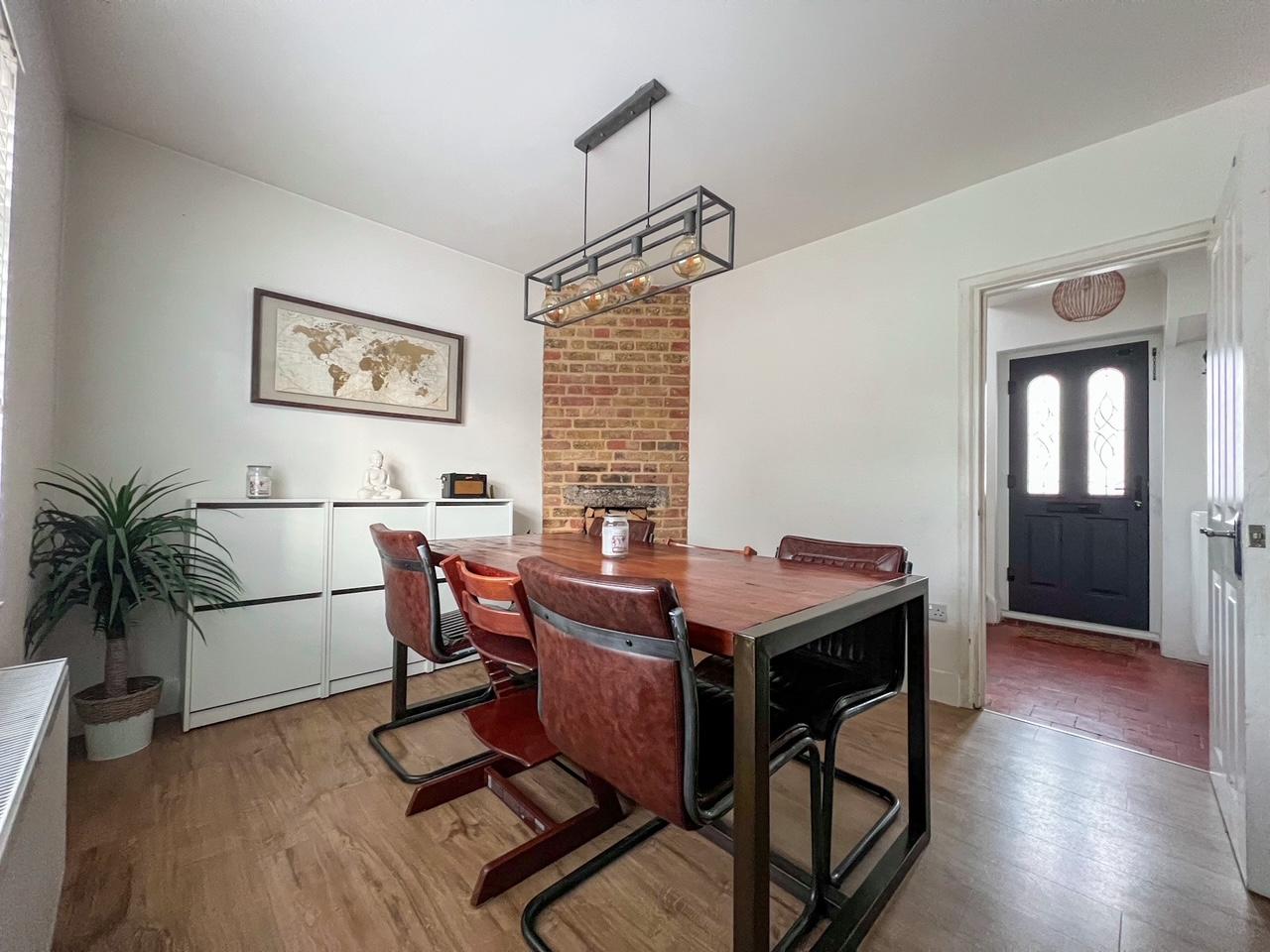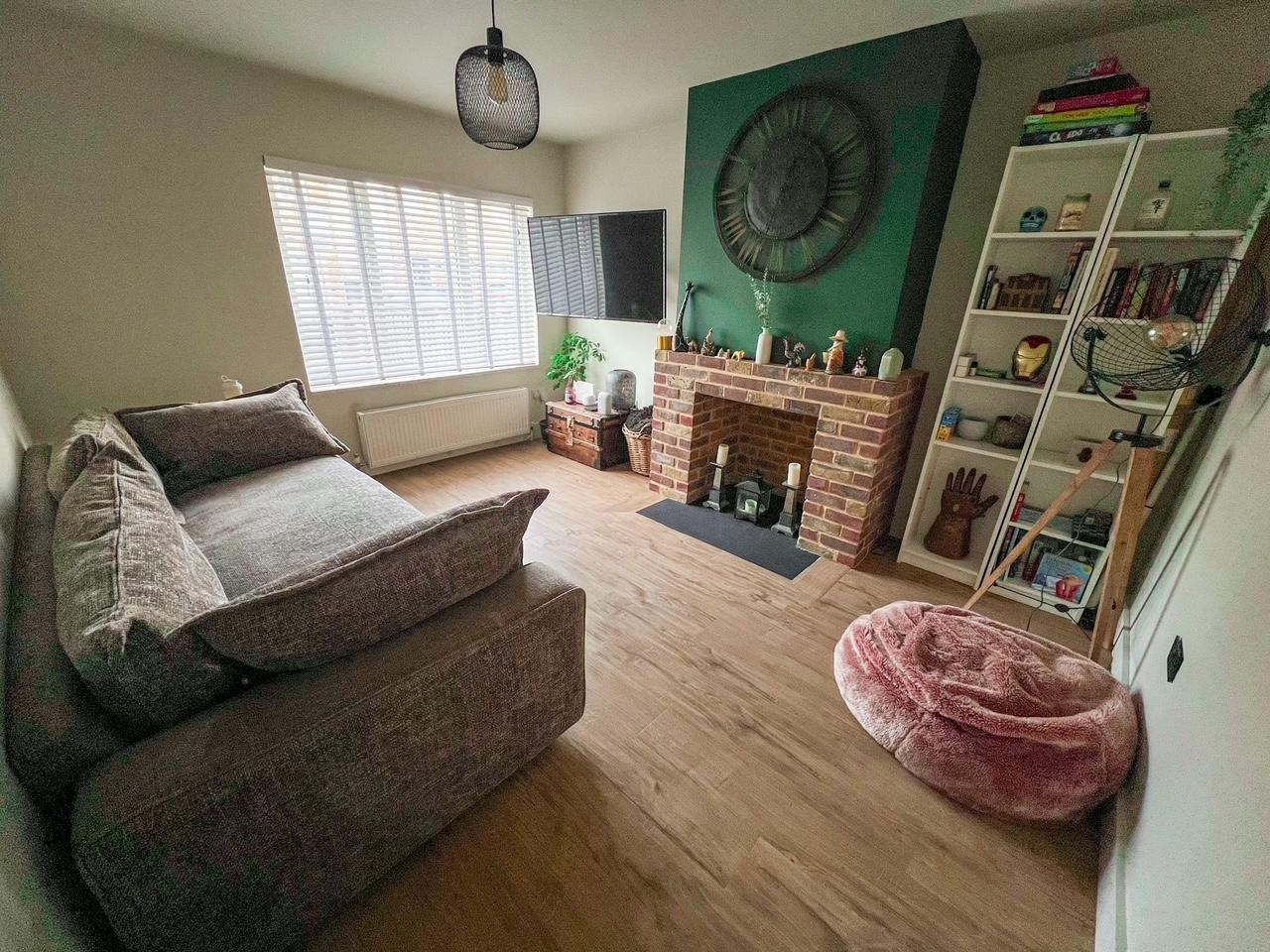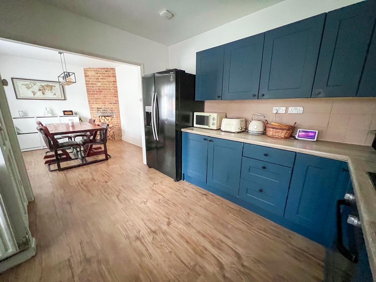 The accommodation comprises: an entrance hallway with Quary tiles and access to a downstairs WC. The hallway also leads to a nicely sized front reception room with featured bricked fireplace and laminated wood flooring, the hallway also leads to a second reception room, currently being used as a dining room with again a feature fireplace with window overlooking the rear garden. The dining room with archway opens onto a nicely sized navy blue kitchen with many eye/base level units/cupboards with wood worktops and integrated oven with gas hob along with space for dishwasher and American style fridge/freezer. A separate lean to conservatory/utility room complements the kitchen with ample hanging space for coats and hats with French doors opening out onto the rear garden. Turning stairs lead to a landing with storage cupboard and access to three nicely balanced bedrooms along with a newly updated bathroom with white suite.