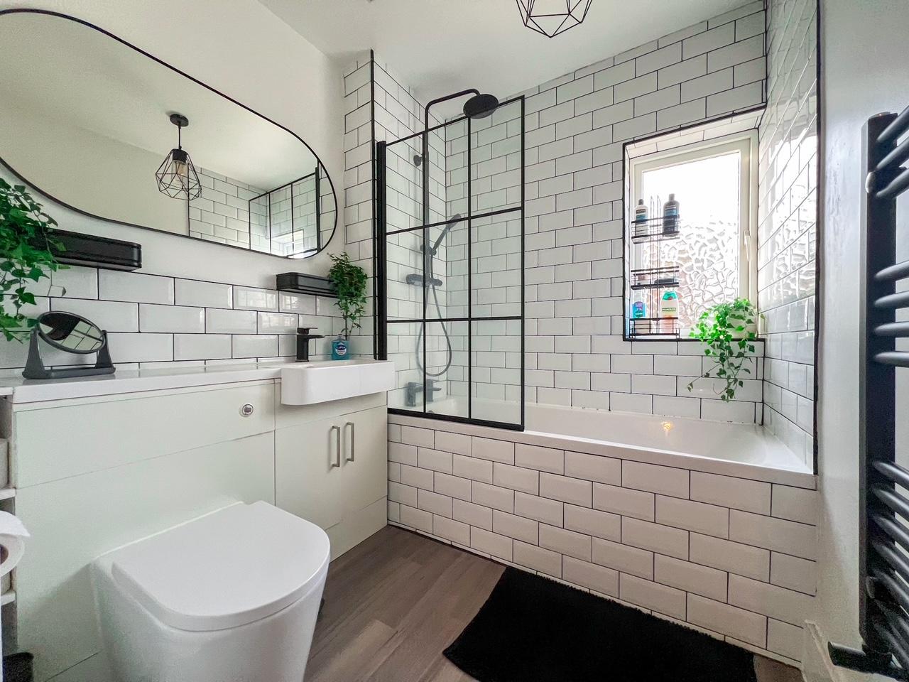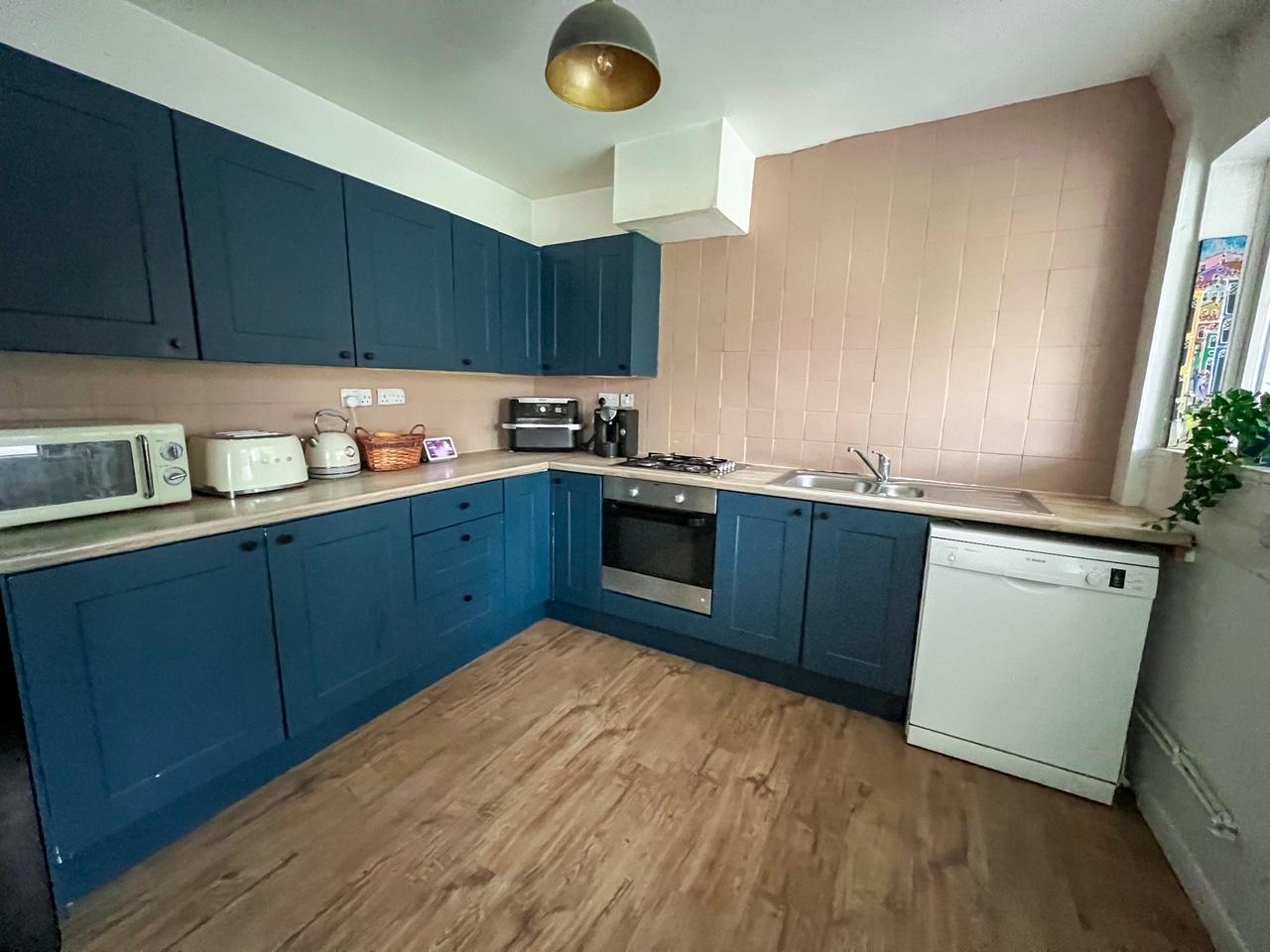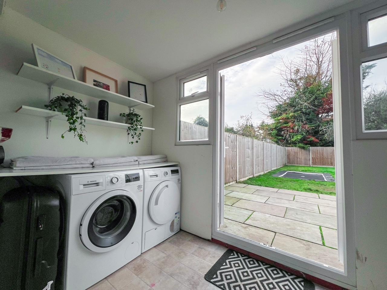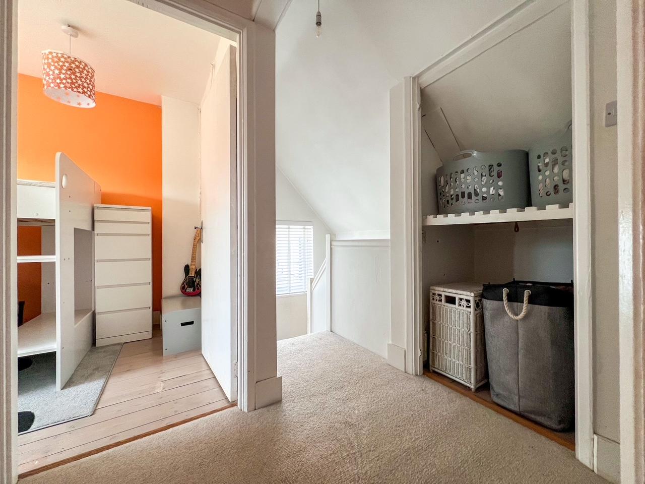 The accommodation comprises: an entrance hallway with Quary tiles and access to a downstairs WC. The hallway also leads to a nicely sized front reception room with featured bricked fireplace and laminated wood flooring, the hallway also leads to a second reception room, currently being used as a dining room with again a feature fireplace with window overlooking the rear garden. The dining room with archway opens onto a nicely sized navy blue kitchen with many eye/base level units/cupboards with wood worktops and integrated oven with gas hob along with space for dishwasher and American style fridge/freezer. A separate lean to conservatory/utility room complements the kitchen with ample hanging space for coats and hats with French doors opening out onto the rear garden. Turning stairs lead to a landing with storage cupboard and access to three nicely balanced bedrooms along with a newly updated bathroom with white suite.
