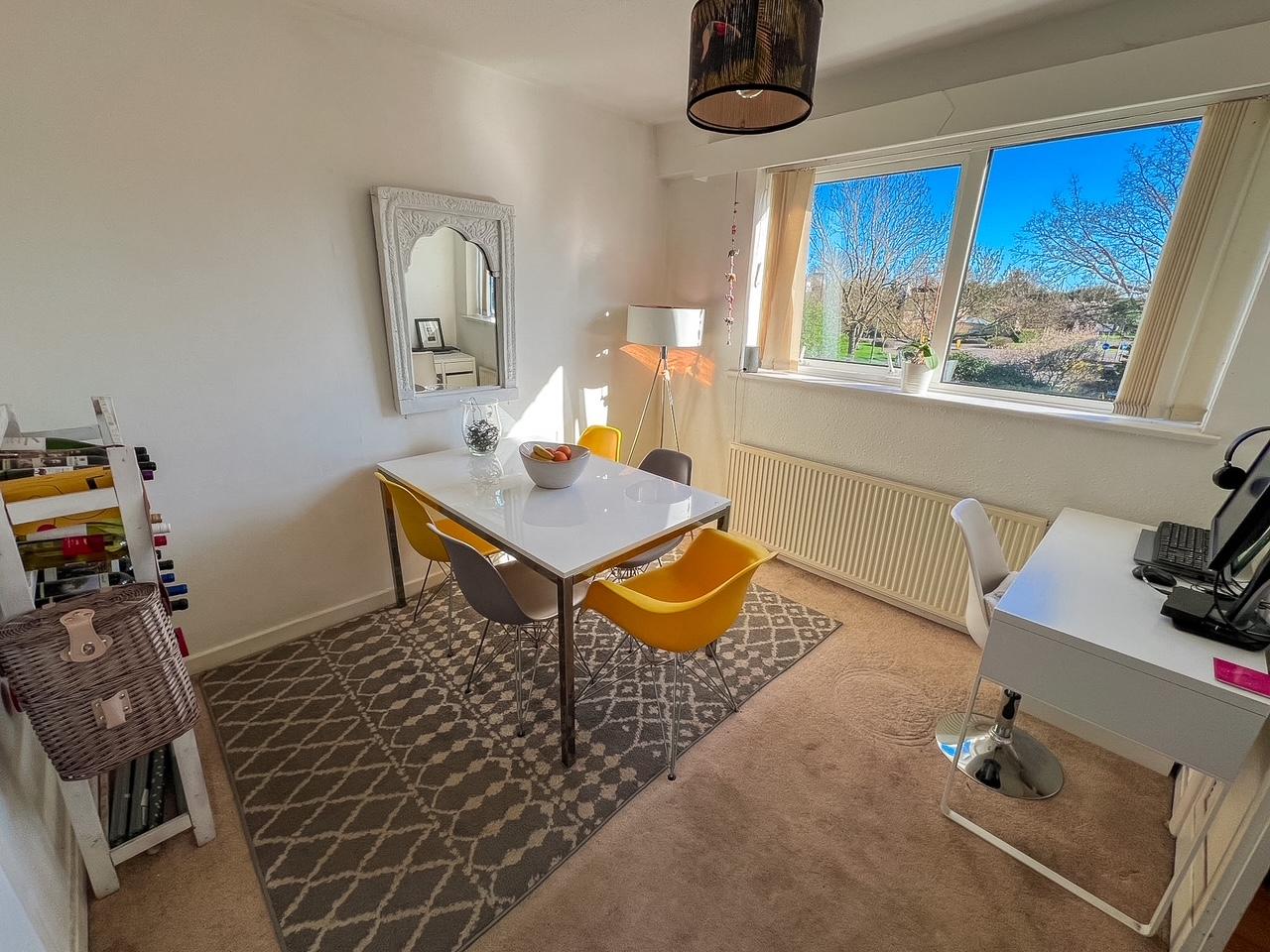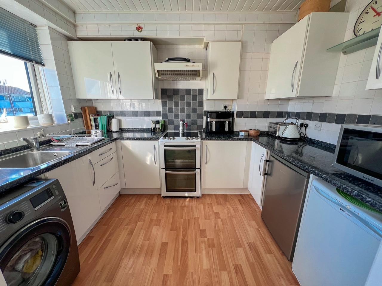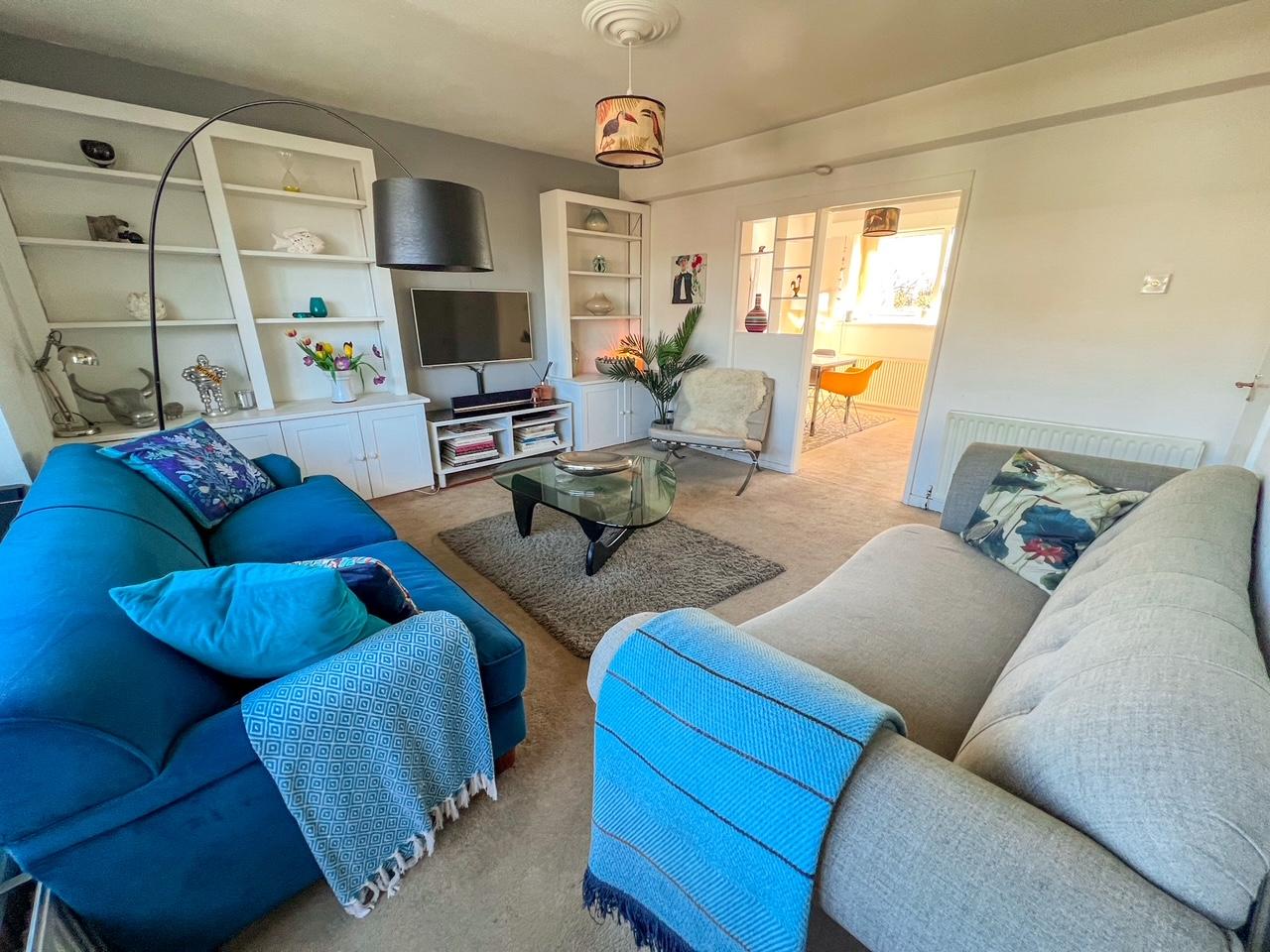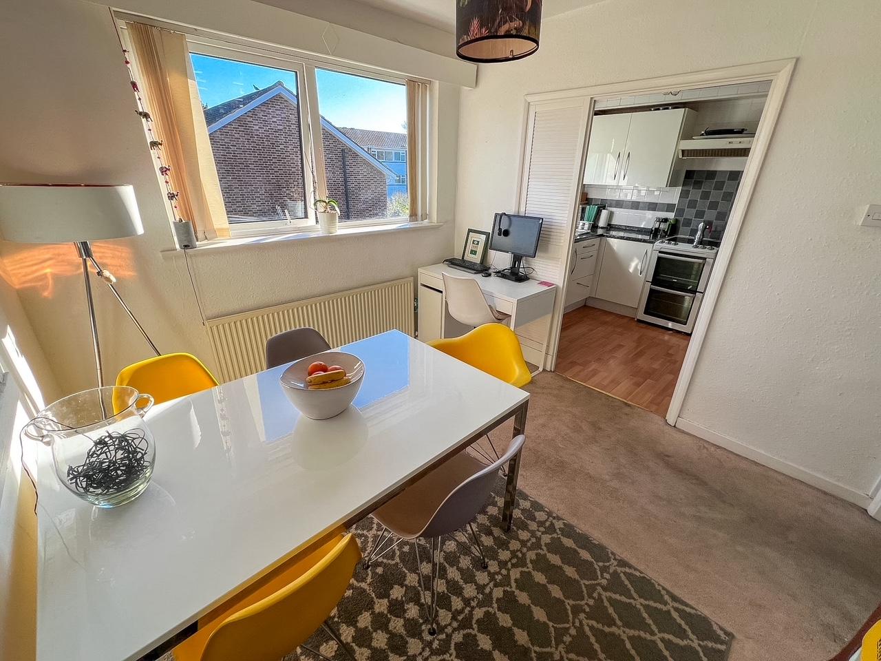 The accommodation comprises; a private entrance with hallway leading to a landing with door opening to an impressive and 13’9 x 13’5 very spacious and bright living room with built in window seat. The living room leads onto a nicely sized dining room with built in shelving and cupboards which enjoys wonderful southerly views and leads to a kitchen with many eye/base level units/cupboards with worktop area and space for freestanding cooker with gas hob, washing machine, fridge and freezer.