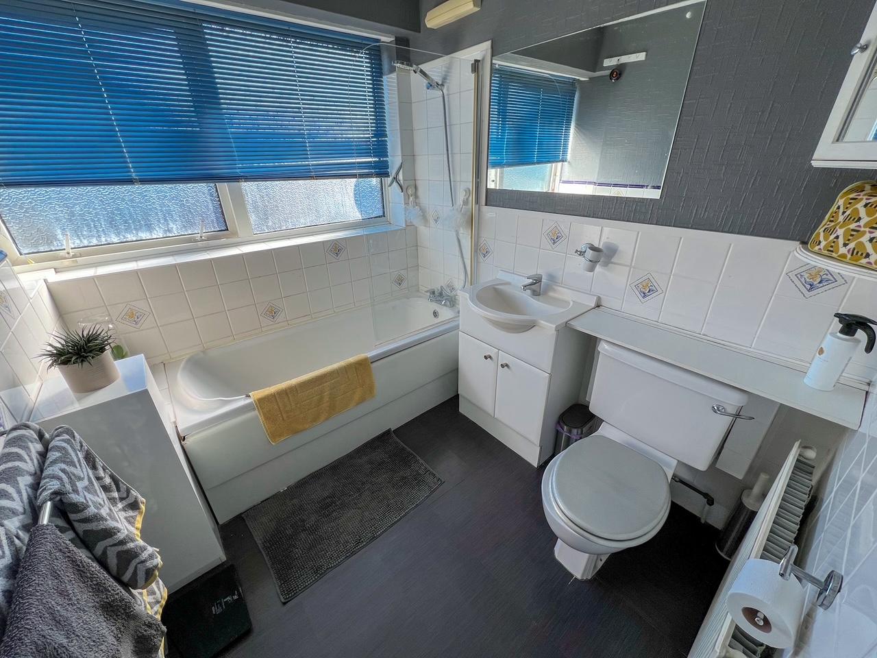Stairs from the living room lead up to a landing with storage cupboard and loft access and access to two generous double bedrooms (both bedrooms with built in wardrobes) and a bathroom with matching white suite.