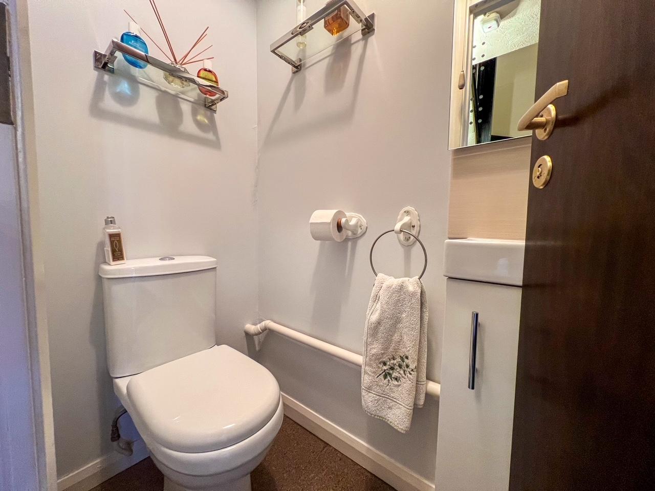Turning stairs lead up to a landing with access to a spacious living room with bay window which enjoys wonderful views and a double bedroom with built in wardrobes. There is also a WC with sink. Further turning stairs from the landing lead up to a landing with access to two impressive double bedrooms (master with built in mirrored sliding wardrobes) and a bathroom with matching suite.